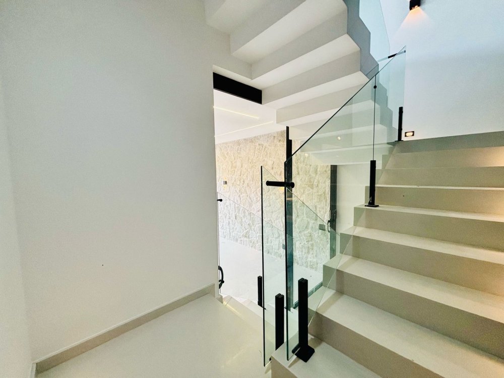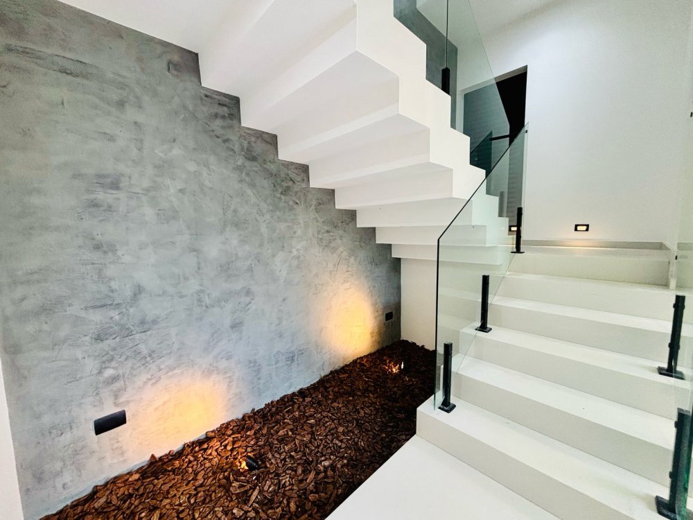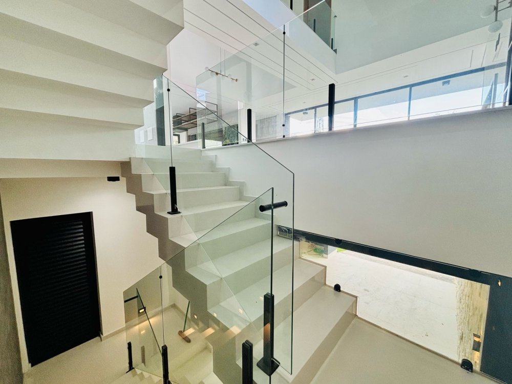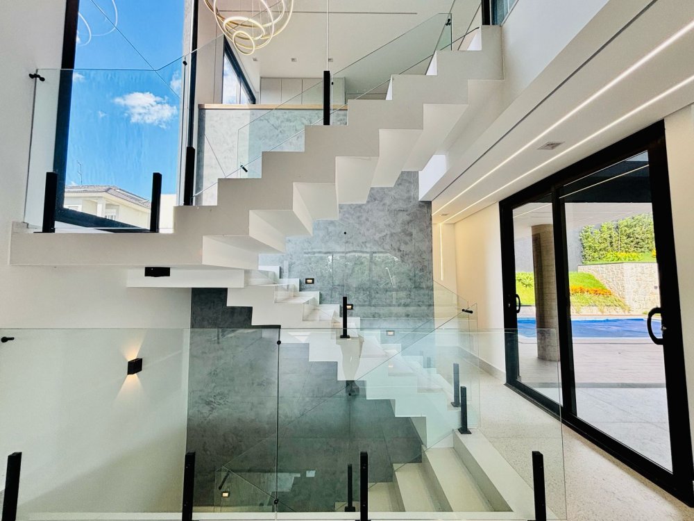 Escada imponente em mármore com guarda-corpo em vidro